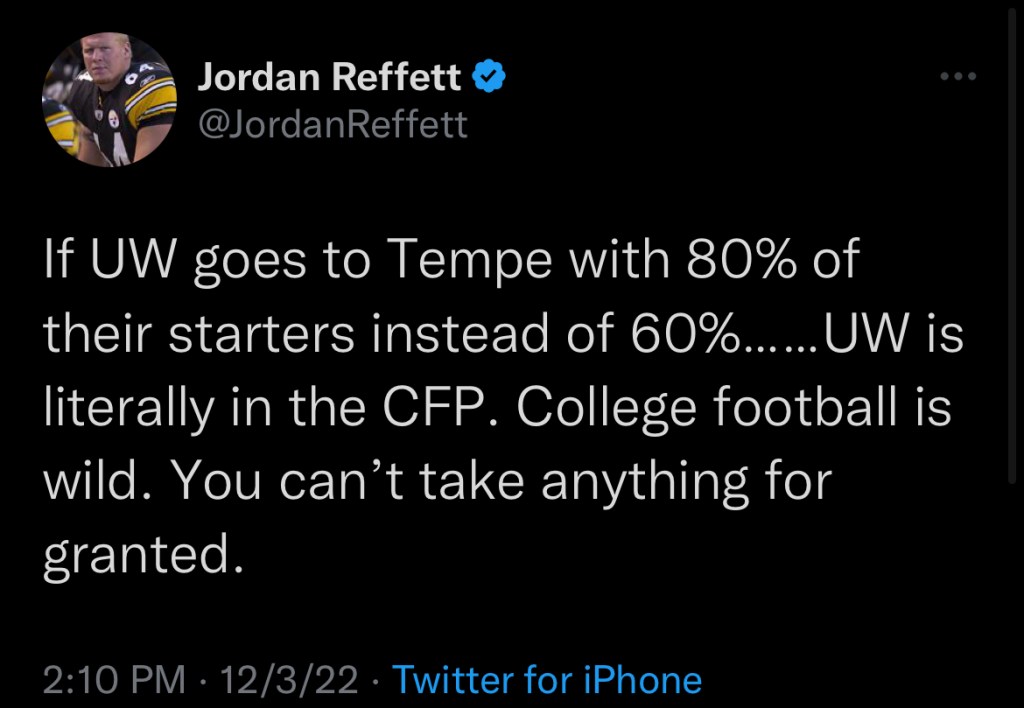 The woulda-coulda-shoulda statements are synonymous with coping. Washington also lost the next week to UCLA, so they literally wouldn’t be in the CFP. College football IS wild but so are the takes coming from Jordan Reffett on a weekly basis.