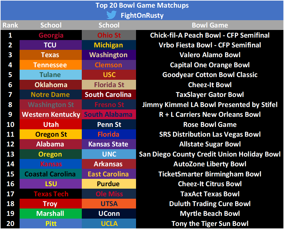 Below are the top 20 bowl game matchups: