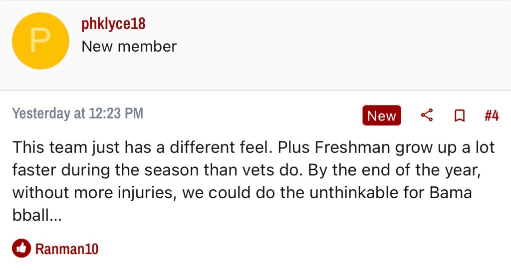 As an ardent, longtime fan of Bama Hoops, I was on cloud 9 after the Tide whipped Kentucky 78-52. It’s always nice to beat them and the utter dismantling was surely a sign that Bama had arrived. Then they lost to the Gamewieners in Rupp and Bama’s victory over Big Blue Nation became just another win.