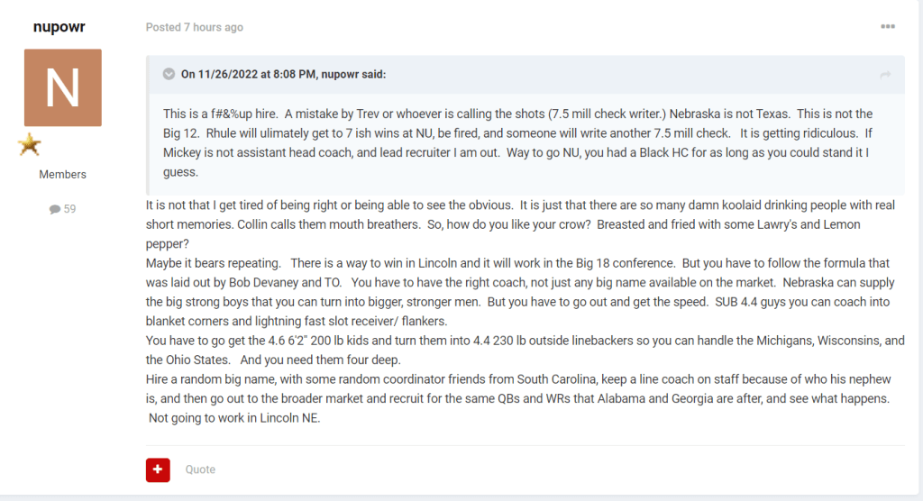 Nebraska fans I know you well. Look, this was always going to be a tough season. Matt Rhule isn’t known for immediate turnarounds. You need to give him at least a year. Historically, year three is where you see his value. That said, you need to stop creating expectations predicated on being the most talented team in the division. Regardless of what recruiting boards say, it is just not the case.