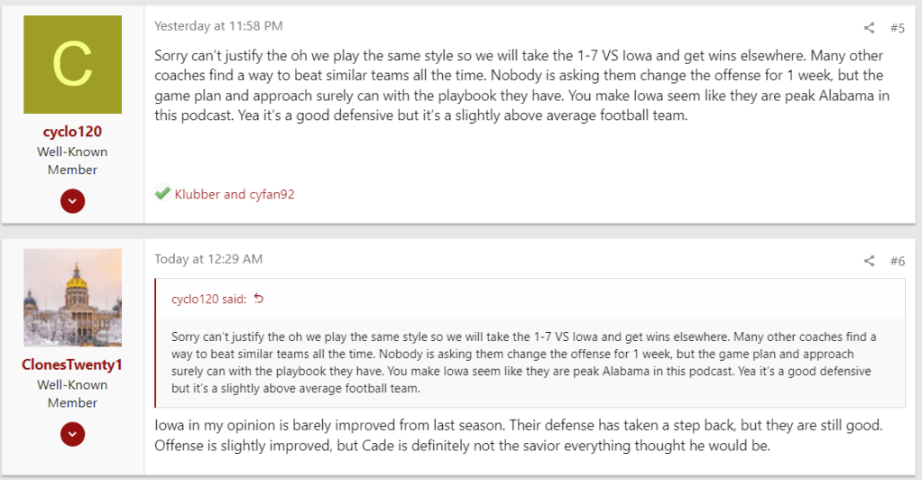 These folks are going to make this as difficult as they can for me to provide advice. So let’s start with this. Iowa State isn’t Iowa and that isn’t necessarily a bad thing. In 2020, Iowa State made a New Year’s Six game (and won it). This is more recent than anything Iowa has done. What was different about that year? CyHawk was not played. Your identity is not that game. Move on. You’ll be fine.