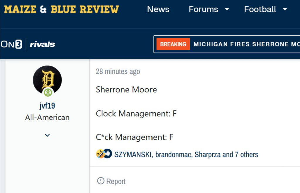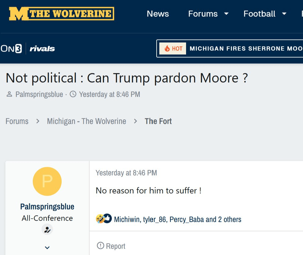 14. This Michigan fan wants a Presidential pardon for Sherrone Moore.