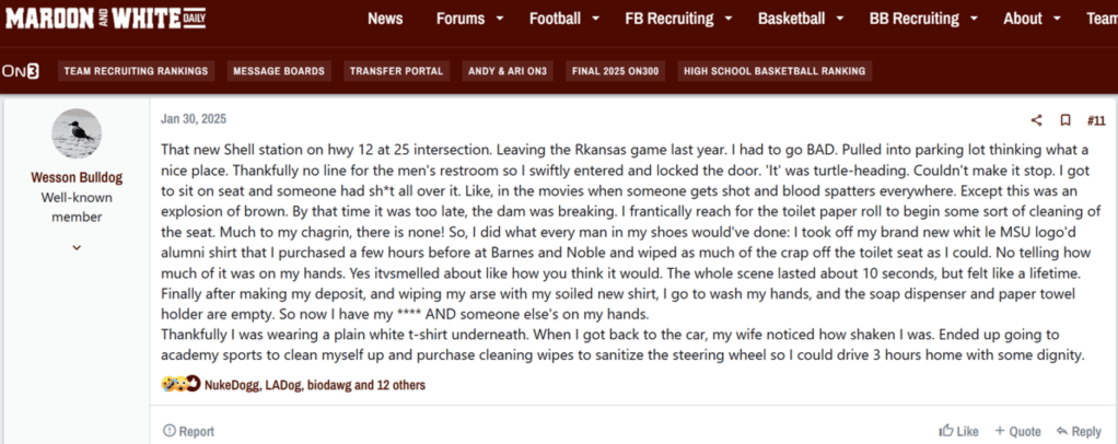 15. This Mississippi State fan shared a fun gas station bathroom story.