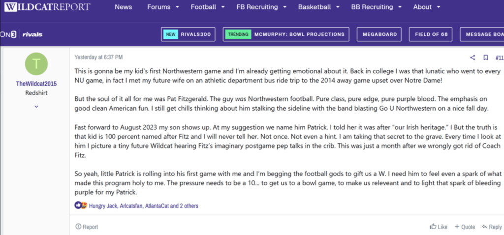 21. A Northwestern fan named his child after Pat Fitzgerald but never told his wife.