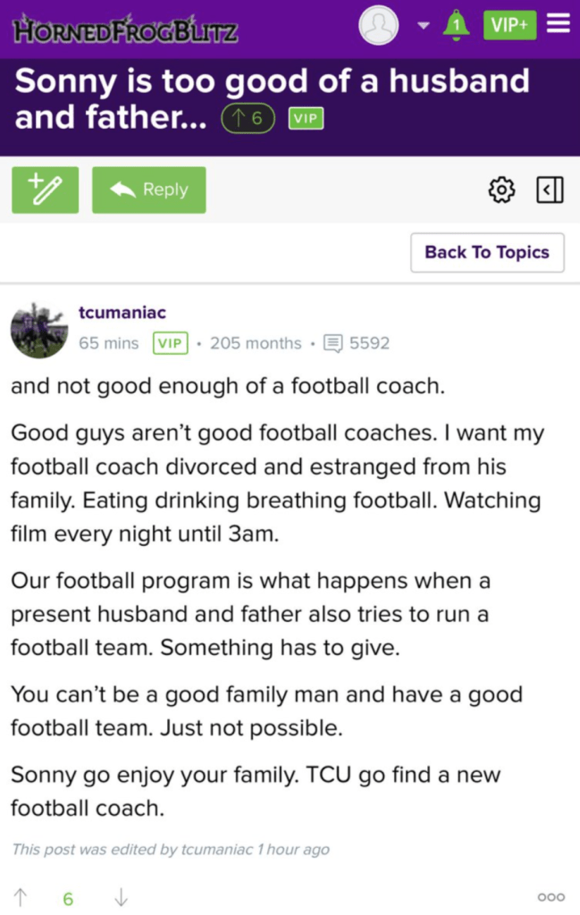 42. Sonny Dykes is too good of a family man to be a good football coach.