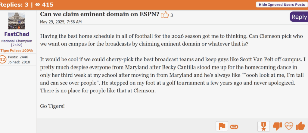 8. This Clemson fan wants to claim eminent domain on ESPN.